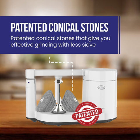 Featuring patented conical stones, it ensures efficient grinding while maintaining a low batter temperature, which promotes natural fermentation and superior taste. The included multi-utility AISI 304 stainless steel drum is rust-resistant and allows for direct batter storage after grinding, saving time and reducing mess.